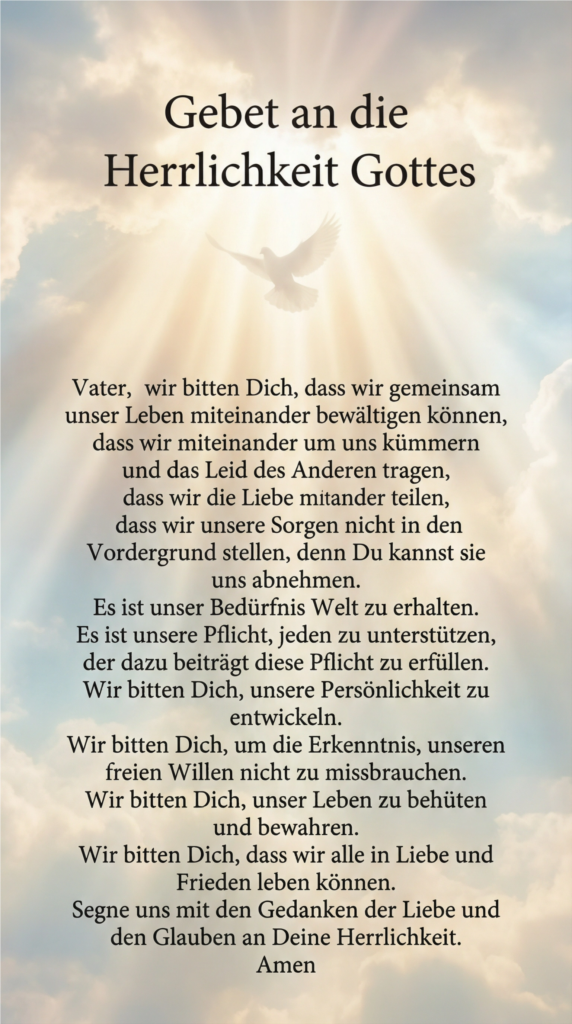 „Ich gehe mit meinen Gedanken bis an die Entstehung der Menschheit zurück. Gott hat uns als Energiewesen geschaffen. Wir waren freie Wesen und nur für uns selbst verantwortlich. Zu unserer Entwicklung gehörte auch die Entwicklung dieses Weltalls. Als das alles vollbracht war und viele Tiere diese Erde schon bevölkerten, kam die nächste Aufgabe:Wir als Energiewesen